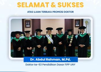 Post date: Wednesday, 23 April, 2025 - 15:20.Ucapan Selamat Atas Promosi DoktorProgram Studi S3 Pendidikan Dasar, Departemen Pendidikan Sekolah Dasar, Fakultas Ilmu Pendidikan dan Psikologi UNY, mengucapkan:"Selamat atas diraihnya gelar Doktor, Dr. Abdul Rahman, M.Pd " Doktor ke-63, S3 Pendidikan Dasar FIPP UNY...