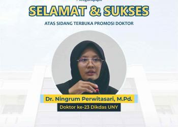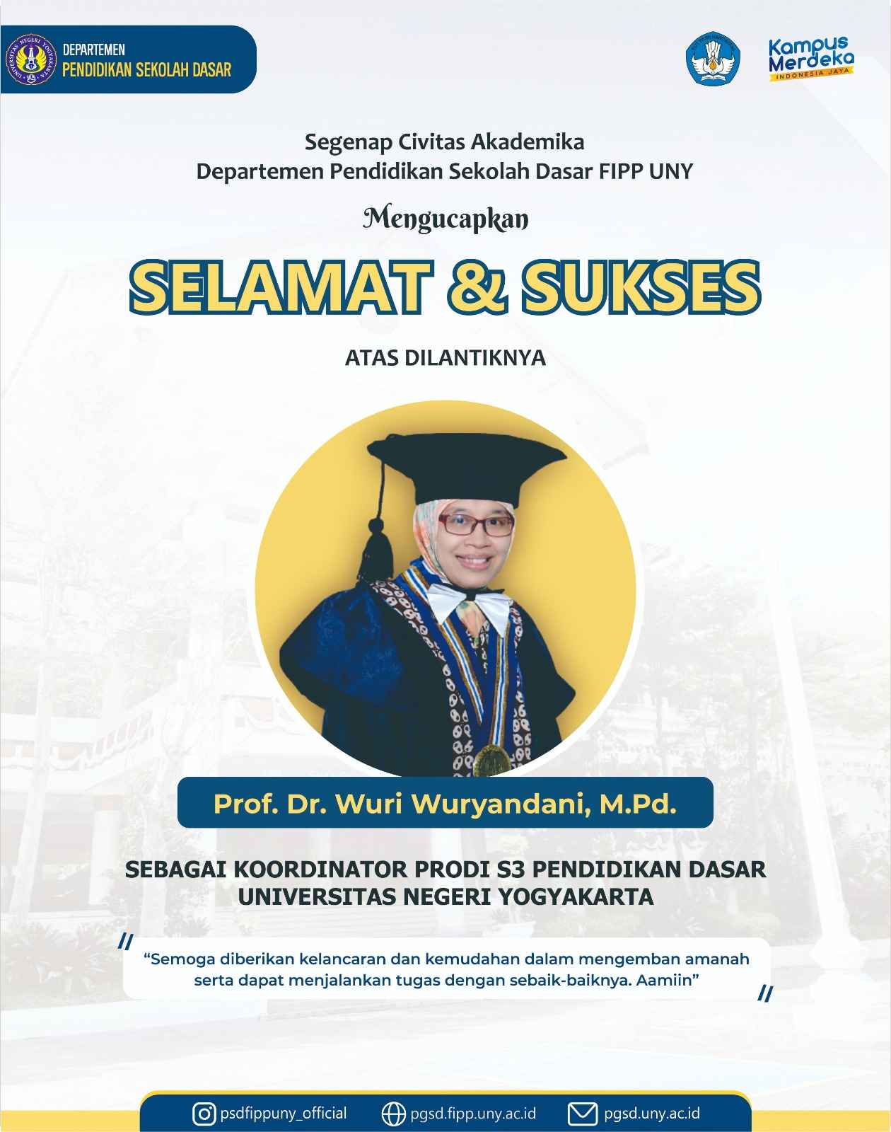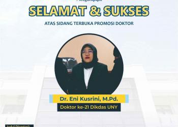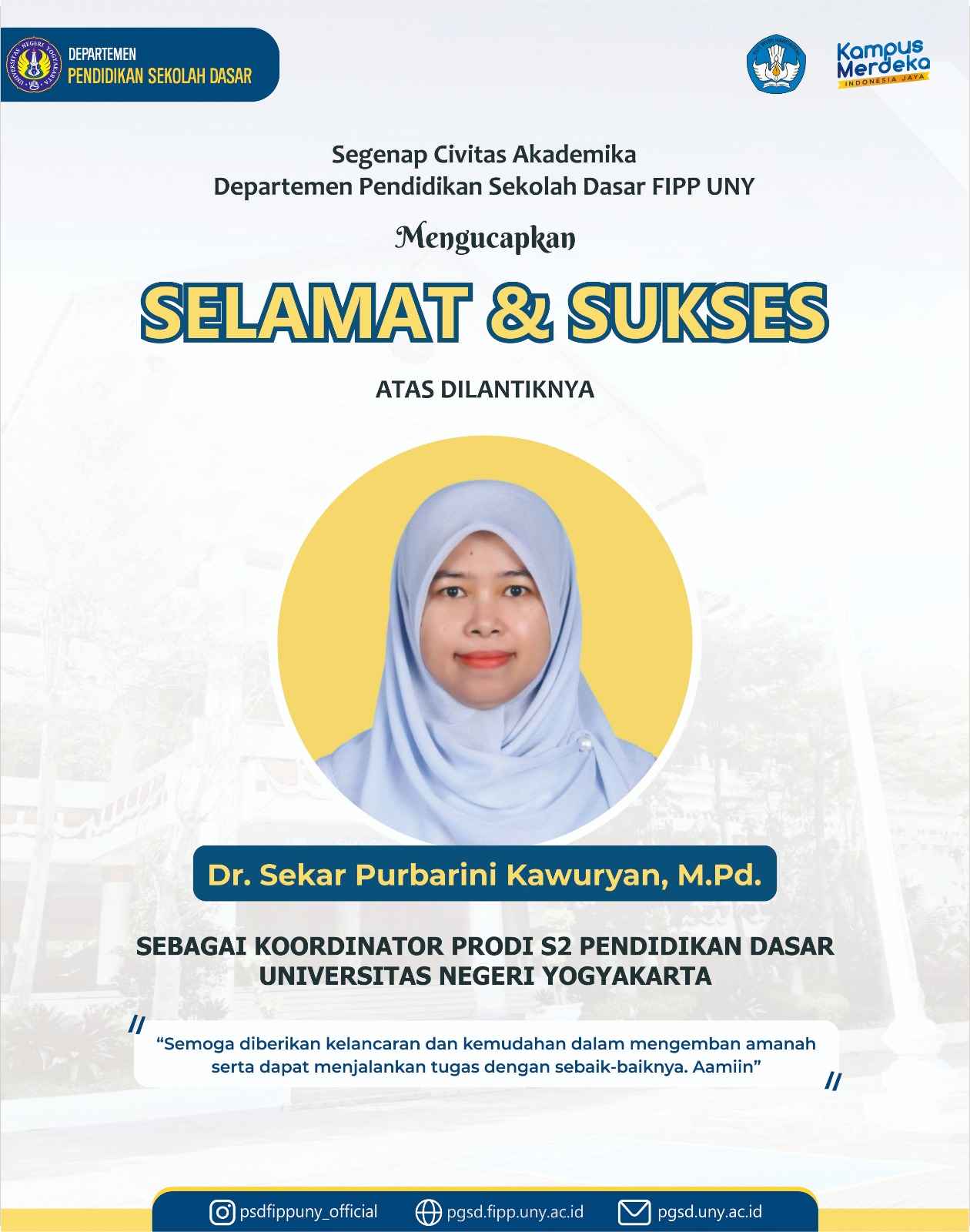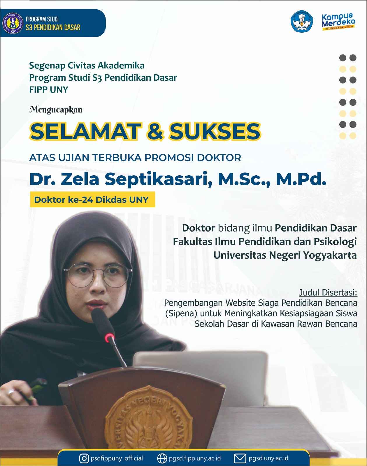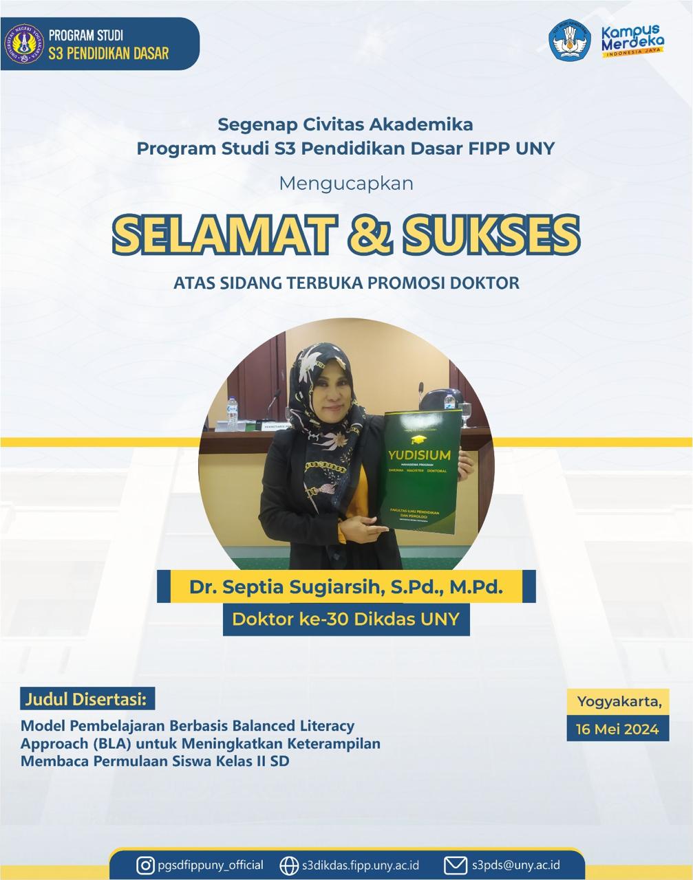 Ucapan Selamat Atas Promosi DoktorProgram Studi S3 Pendidikan Dasar, Departemen Pendidikan Sekolah Dasar, Fakultas Ilmu Pendidikan dan Psikologi UNY, mengucapkan:"Selamat atas diraihnya gelar Doktor, dari: Ibu Dr.Septia Sugiarsih, S.Pd., M.Pd.." Doktor ke-30, S3 Pendidikan...
