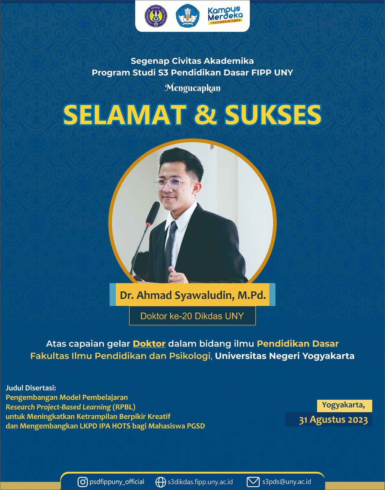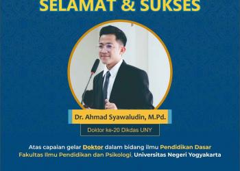 Post date: Sunday, 3 September, 2023 - 21:04.Ucapan Selamat Atas Promosi DoktorProgram Studi S3 Pendidikan Dasar, Departemen Pendidikan Sekolah Dasar, Fakultas Ilmu Pendidikan dan Psikologi UNY, mengucapkan:"Selamat atas diraihnya gelar Doktor, dari: Bapak Dr. Ahmad Syawaludin, M.Pd.". Doktor ke-20, S3 Pendidikan...