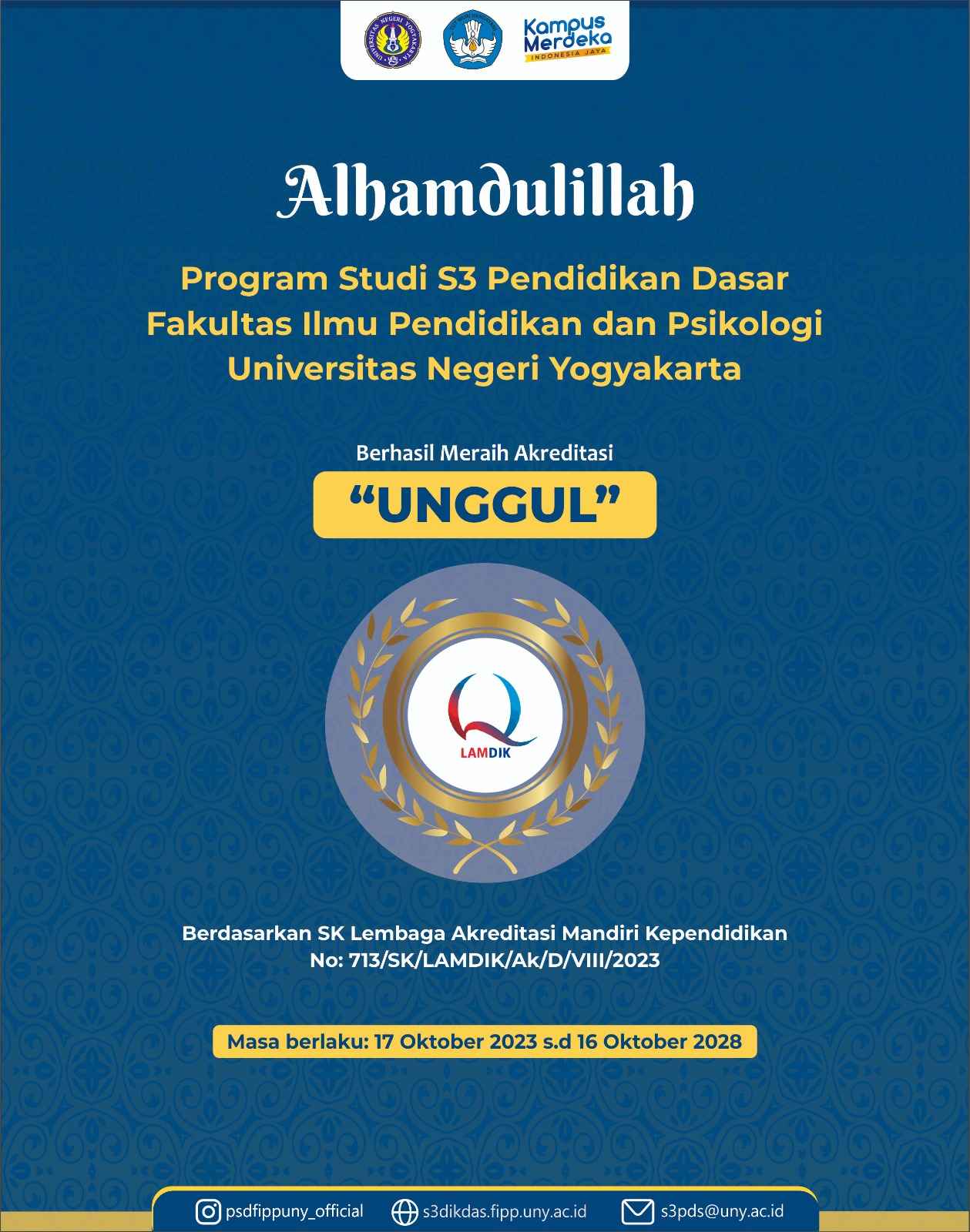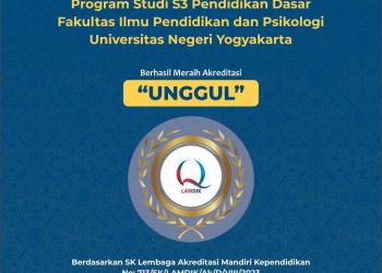 Post date: Tuesday, 5 September, 2023 - 09:40Syukur Alhamdulillah Atas Capaian Akreditasi "UNGGUL" Program Studi S3 Pendidikan Dasar FIPP UNYAlhamdulillah, atas berkat Rahmat Allah SWT, Program Studi S3 Pendidikan Dasar, dapat kembali memperoleh capaian Akreditasi "UNGGUL" oleh Lembaga Akreditasi LAMDIK sesuai SK No:...