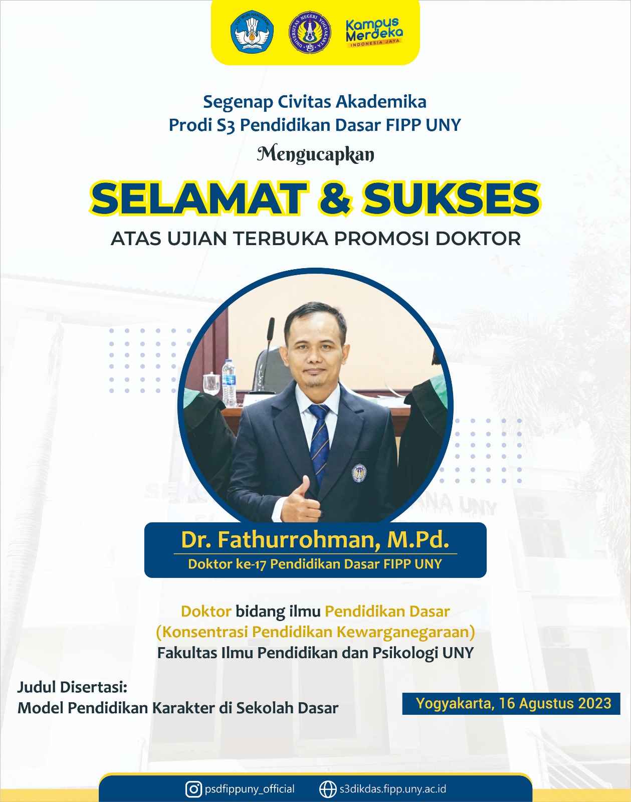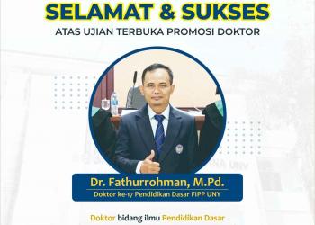 Post date: Wednesday, 16 August, 2023 - 16:00Ucapan Selamat Atas Promosi Doktor Program Studi S3 Pendidikan Dasar, Departemen Pendidikan Sekolah Dasar, Fakultas Ilmu Pendidikan dan Psikologi UNY, mengucapkan:"Selamat atas diraihnya gelar Doktor, dari: Bapak Dr. Fathurrohman, M.Pd." Doktor ke-17, S3 Pendidikan...