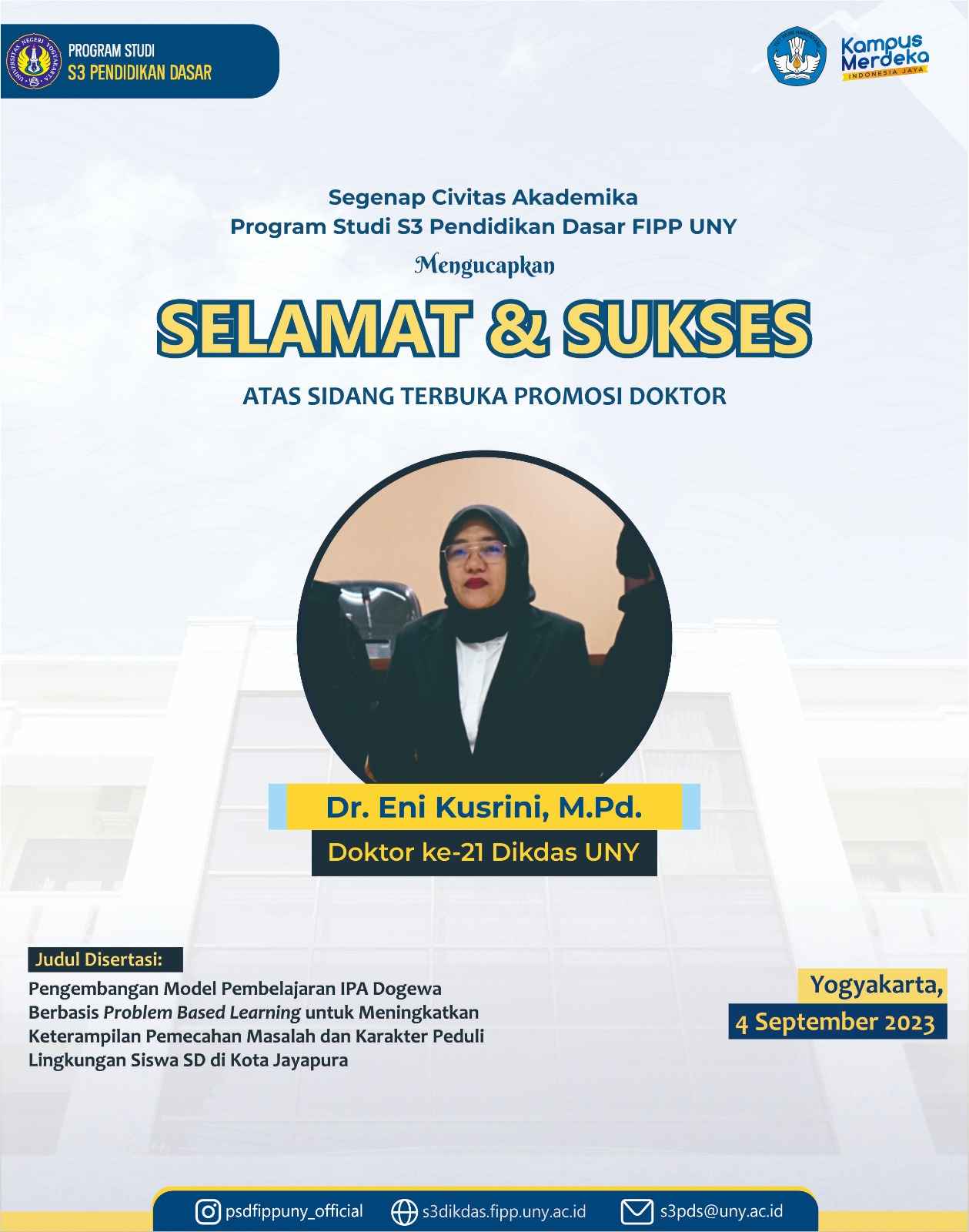 Post date: Tuesday, 12 September, 2023 - 15:46.Ucapan Selamat Atas Promosi DoktorProgram Studi S3 Pendidikan Dasar, Departemen Pendidikan Sekolah Dasar, Fakultas Ilmu Pendidikan dan Psikologi UNY, mengucapkan:"Selamat atas diraihnya gelar Doktor, dari: Ibu Dr. Eni Kusrini, M.Pd." Doktor ke-21, S3 Pendidikan Dasar...