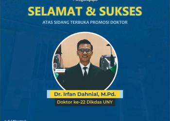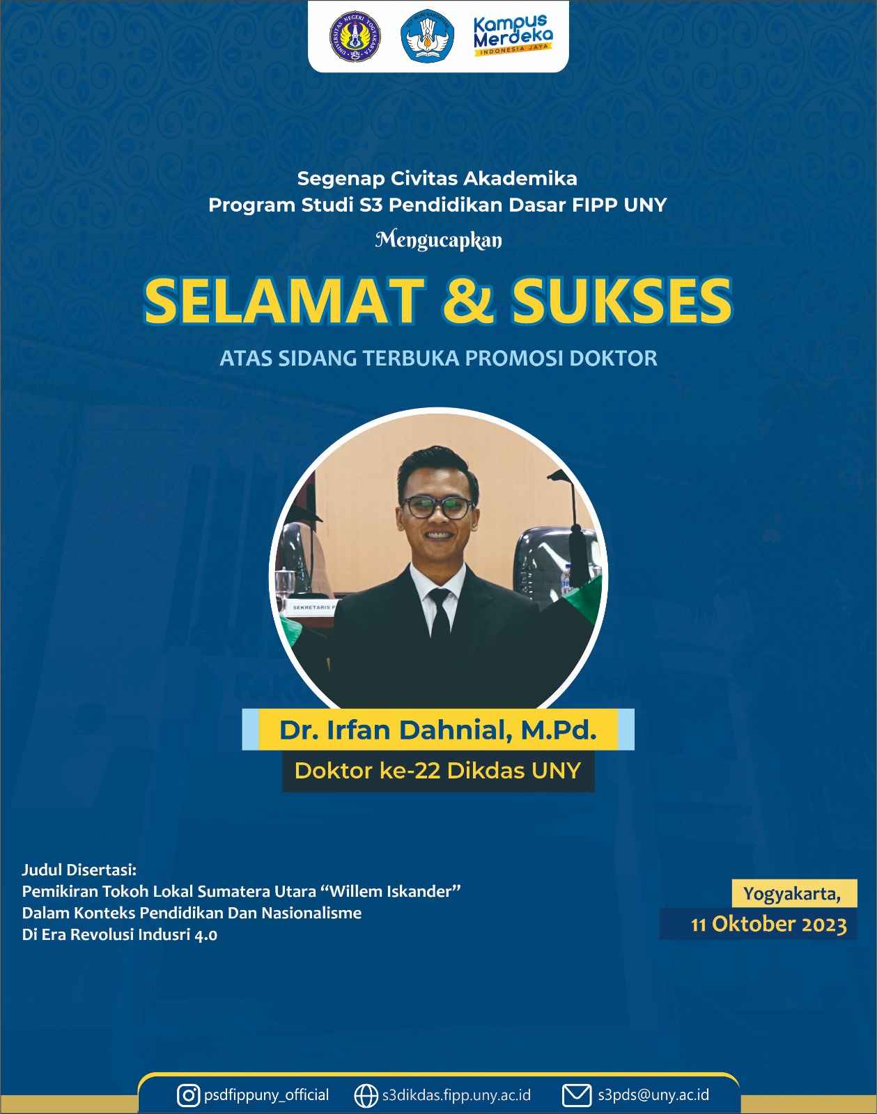 Post date: Tuesday, 7 November, 2023 - 14:22.Ucapan Selamat Atas Promosi DoktorProgram Studi S3 Pendidikan Dasar, Departemen Pendidikan Sekolah Dasar, Fakultas Ilmu Pendidikan dan Psikologi UNY, mengucapkan:"Selamat atas diraihnya gelar Doktor, dari: Bapak Dr. Irfan Dahnial, M.Pd." Doktor ke-22, S3 Pendidikan Dasar...