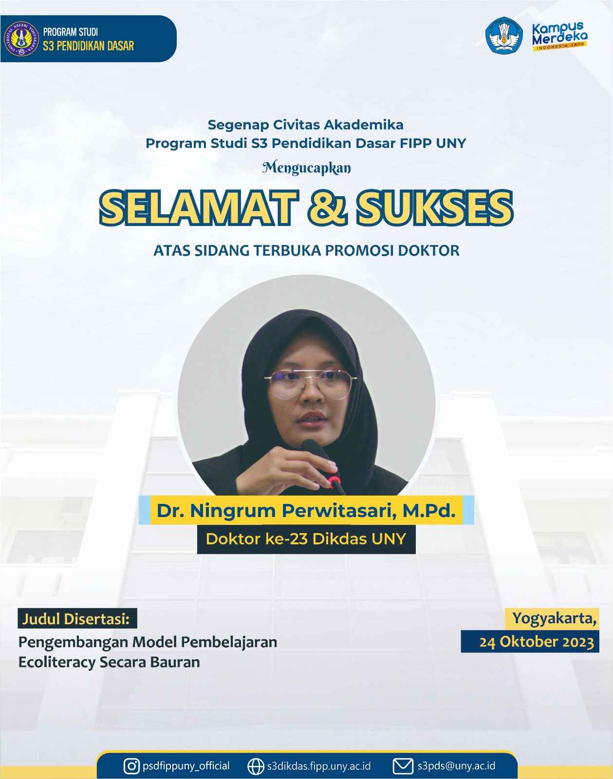 Post date: Tuesday, 7 November, 2023 - 14:28Ucapan Selamat Atas Promosi DoktorProgram Studi S3 Pendidikan Dasar, Departemen Pendidikan Sekolah Dasar, Fakultas Ilmu Pendidikan dan Psikologi UNY, mengucapkan:"Selamat atas diraihnya gelar Doktor, dari: Ibu Dr. Ningrum Perwitasari, M.Pd." Doktor ke-23, S3 Pendidikan...