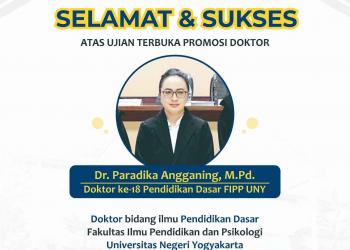 Post date: Thursday, 24 August, 2023 - 22:10.Ucapan Selamat Atas Promosi DoktorProgram Studi S3 Pendidikan Dasar, Departemen Pendidikan Sekolah Dasar, Fakultas Ilmu Pendidikan dan Psikologi UNY, mengucapkan:"Selamat atas diraihnya gelar Doktor, dari: Ibu Dr. Paradika Angganing, M.Pd." Doktor ke-18, S3 Pendidikan...